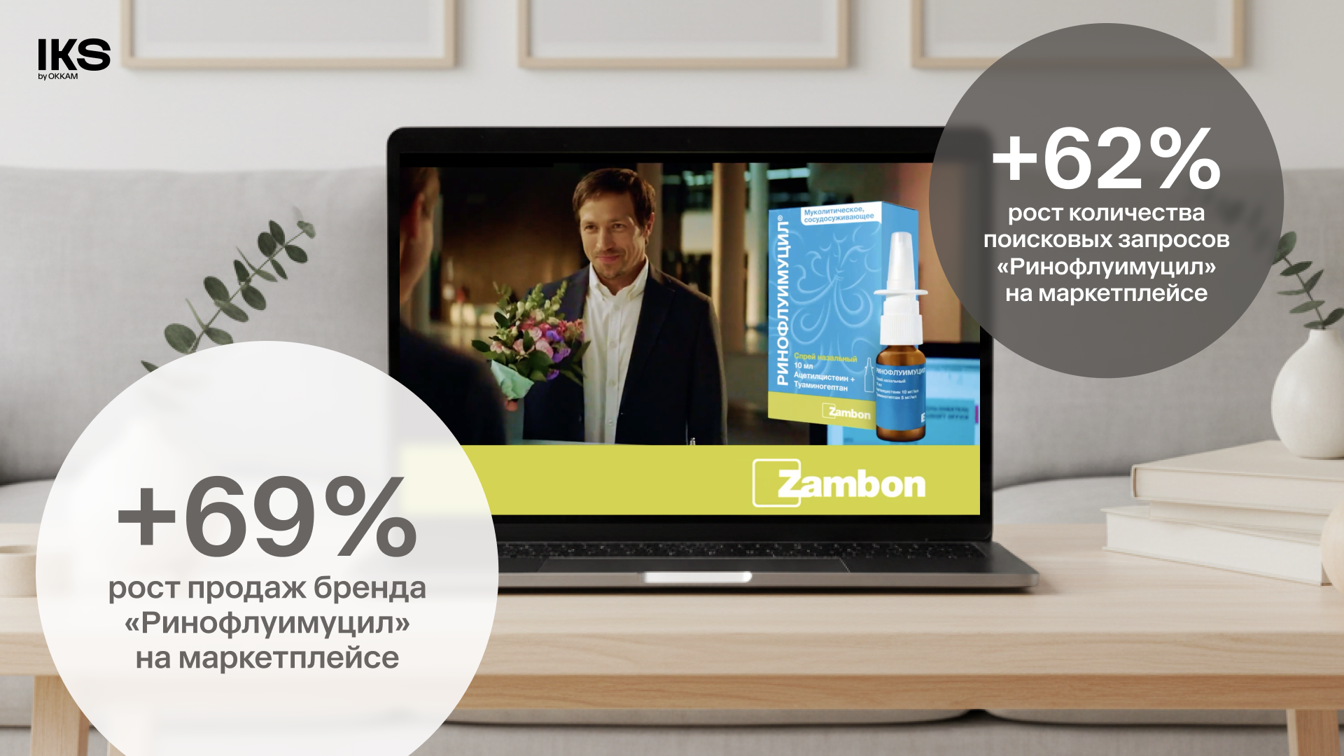 В период ТВ-флайта (22 дня) продажи бренда на маркетплейсе увеличились на 69%. Количество поисковых запросов «Ринофлуимуцил» на маркетплейсе выросло на 62%. Эффект сохранился и после завершения РК: доля продаж осталась на уровне 27%, динамика запросов — на уровне 34% в категории премиальных назальных спреев.