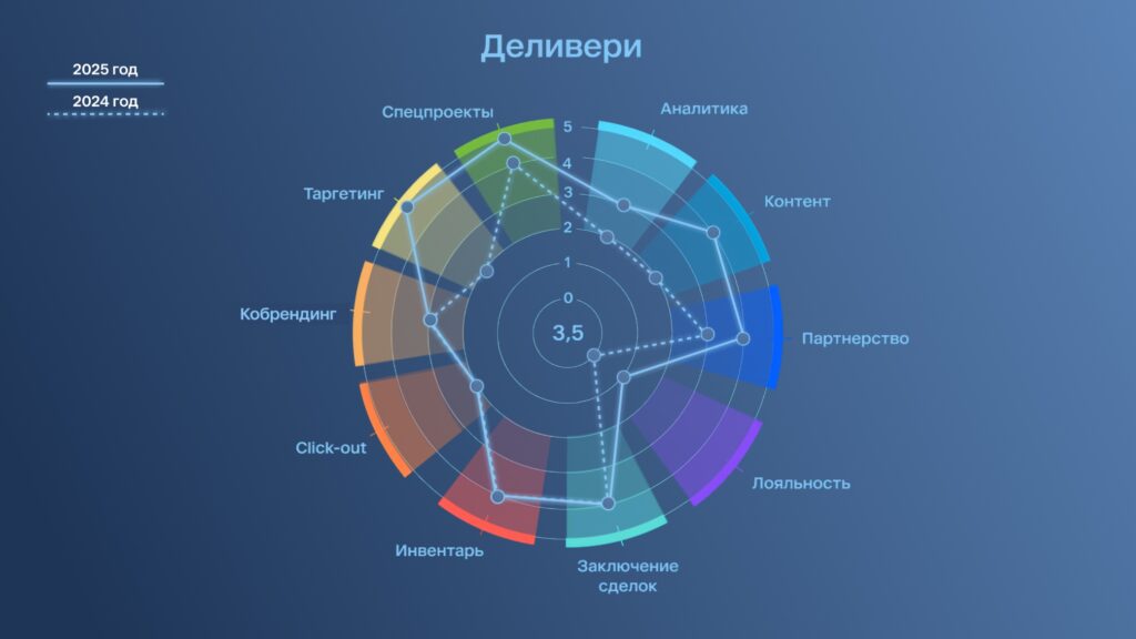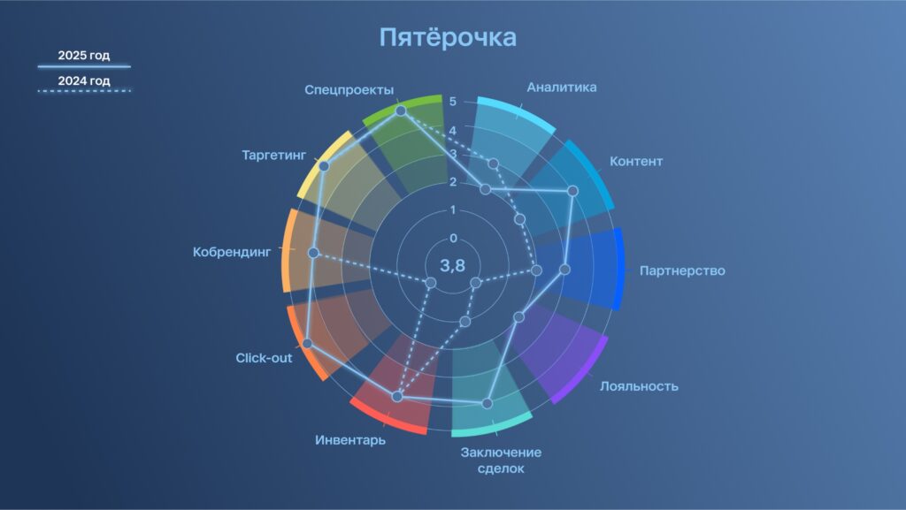 Ozon третий год подряд сохраняет лидерство в 7 из 11 категорий, включая «Таргетинг», «Аналитику» и «Партнерства». Платформа развивает продвинутые инструменты click-out, более 10 форматов баннеров, а также предоставляет детальные метрики brand lift и sales uplift, позволяющие оценивать влияние digital-активностей на офлайн-продажи.