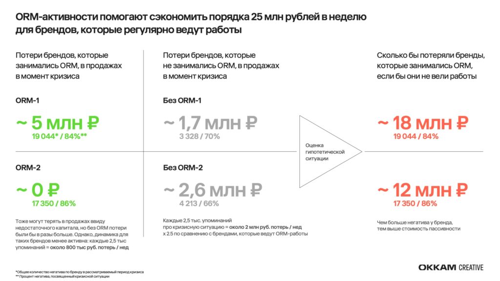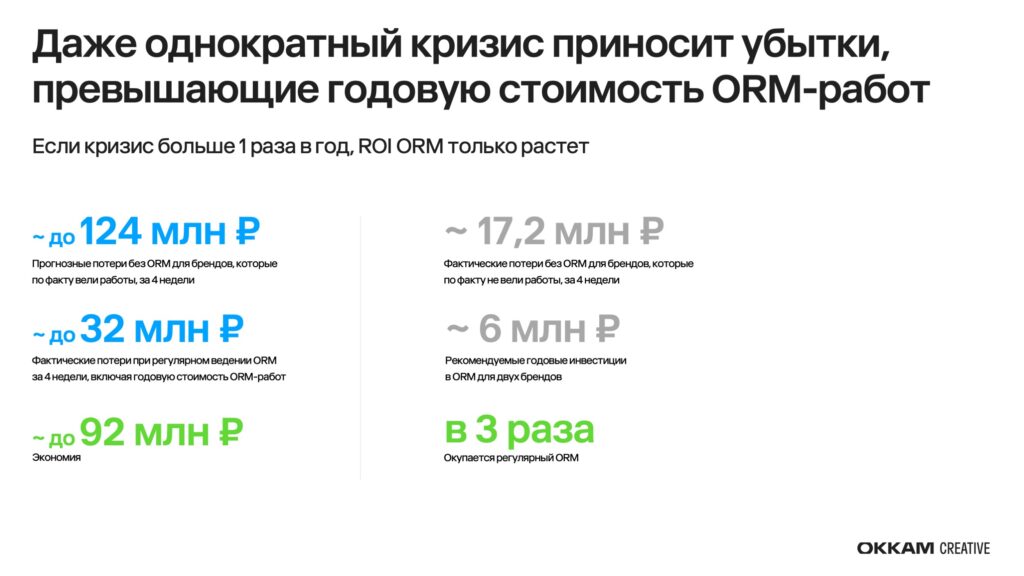 Даже один серьезный кризис способен полностью окупить годовой бюджет на ORM. Согласно исследованию, прогнозируемые потери без ORM для брендов, которые по факту вели работы, составили бы до 124 млн руб. за четыре недели. Фактические убытки для бизнесов оказались в 3 раза меньше ― до 32 млн руб.