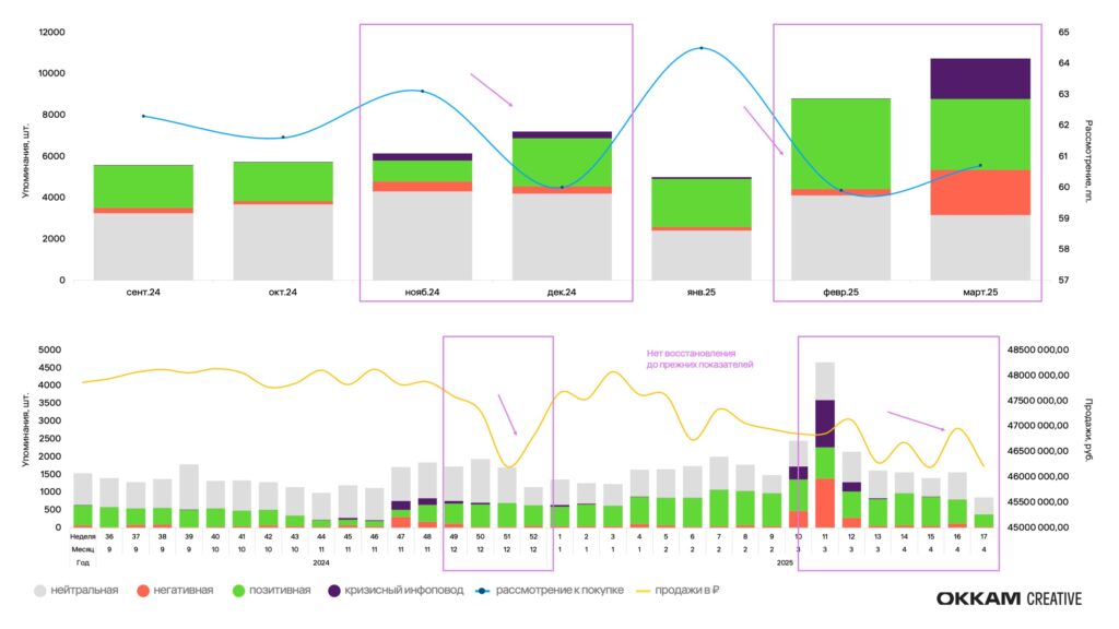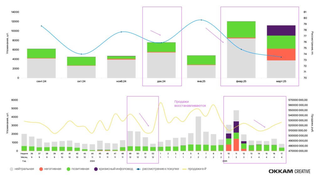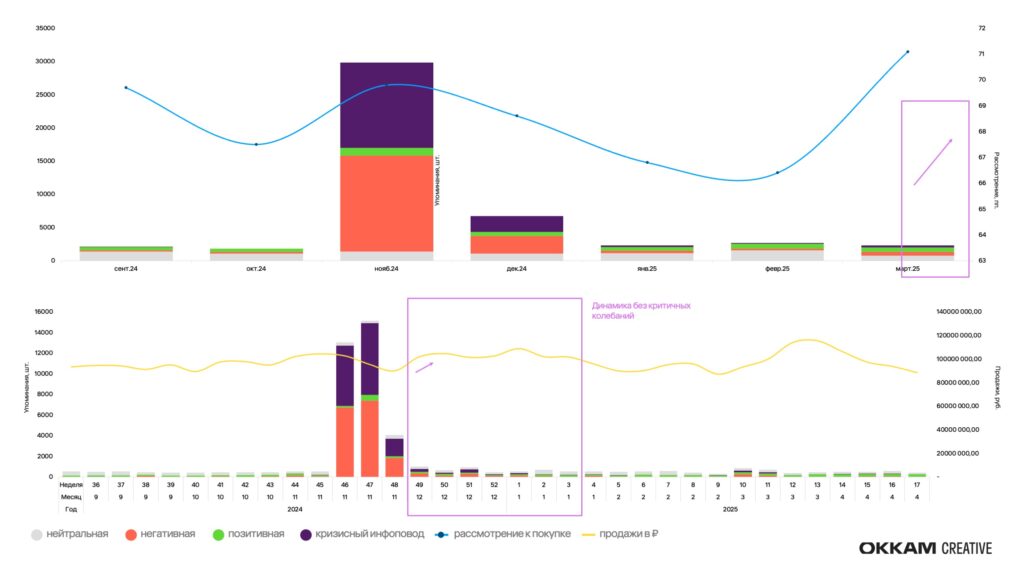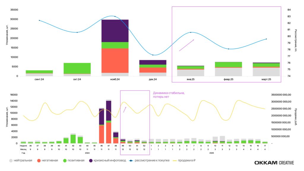 Данные собирались с сентября 2024 по апрель 2025 года. Анализировали показатели продаж (по данным Первого ОФД), бренд-метрики, имиджевые индикаторы, а также упоминания брендов и кризисной ситуации в соцсетях, СМИ и на маркетплейсах. Продажи очищались от влияния цены с помощью регрессионного анализа, что позволило выделить чистый эффект кризиса. Потери брендов оценивались как разница между средними продажами до и после инфоповода, а также учитывались имиджевые и брендовые метрики.