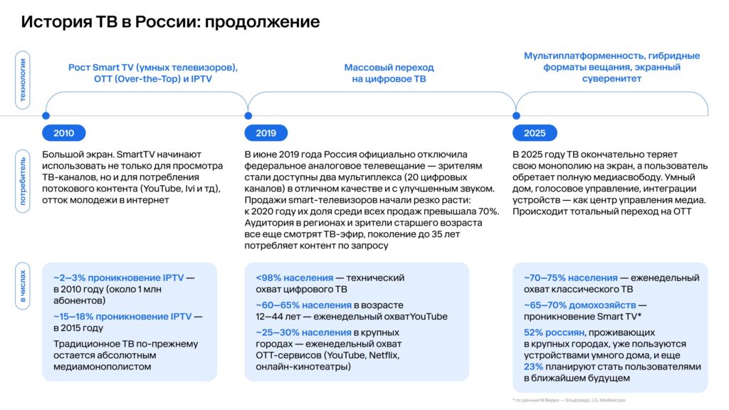 Аудитория получила возможность выбора не только контента, но и способа его просмотра. В результате медиапотребление стало фрагментированным, а инфраструктура — многосоставной: телесмотрение существует одновременно в эфире, в сетях операторов и в онлайне. Для рекламодателей это означает переход от единого канала закупки к комплексной работе с несколькими типами инвентаря и разными логиками планирования.