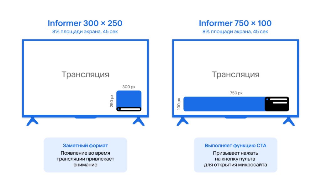 - по доступным форматам — pre-roll, mid-roll, patch-roll, switch-roll с дополнительными интерактивными возможностями (pause banner, connected TV video и другими);