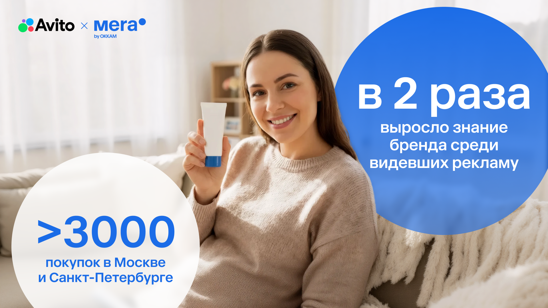 Команда Mera by Okkam строила коммуникацию на нативных форматах Авито: статичных баннерах и сниппете, стилистически встроенных в ленту и карточки товаров. Их дизайн был предельно тактичным, без агрессивных визуальных акцентов, но с четкой фиксацией УТП препарата. Это создавало необходимую атмосферу доверия: пользователь видел ненавязчивое сообщение, которое помогает сориентироваться в решении проблемы.