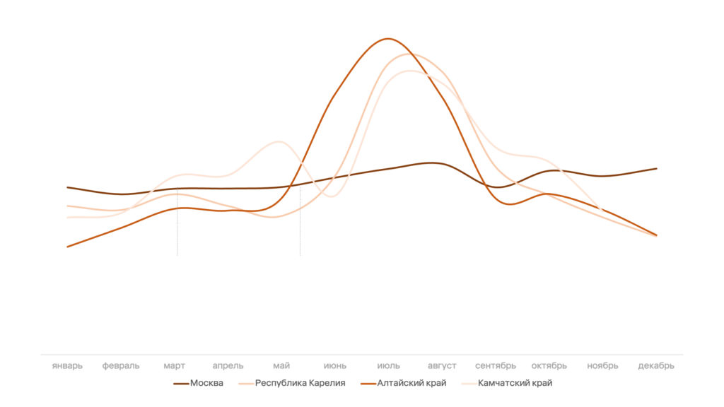 Разница показателей отражает и специфику туристического спроса: природные локации востребованы только в определенный сезон, а крупные города и курорты — круглый год. Сравним, например, Москву, крупный город, и три региона, для которых характерен сезонный спрос, — Карелию, Камчатский и Алтайский края. На диаграмме показана доля числа ночевок по месяцам от общего числа ночевок в год.