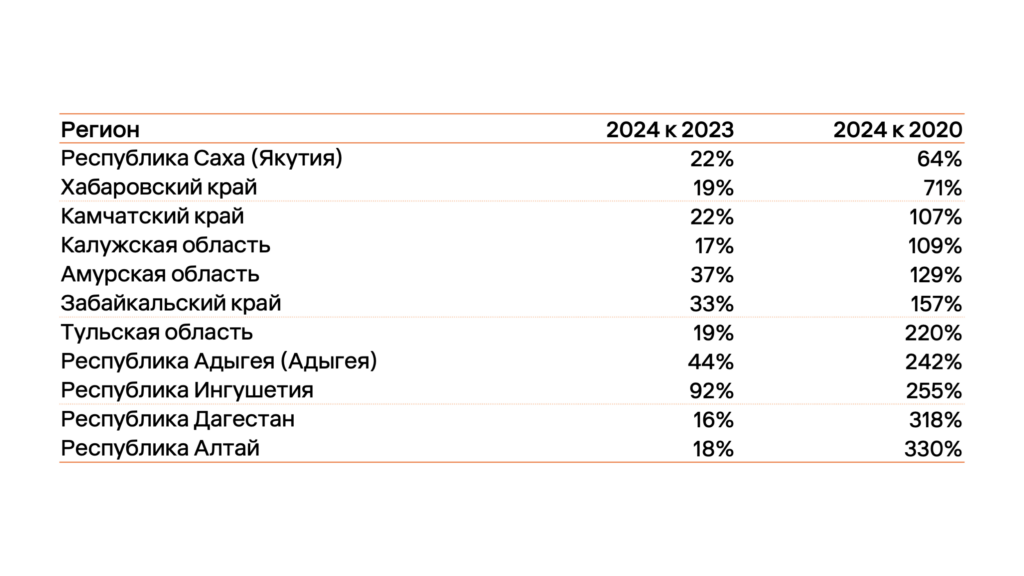 Инвесторы могут найти новые возможности, если обратят внимание на проекты в регионах с низкой обеспеченностью, в которых турпоток растет. Опираясь на данные Росстата, можно выделить регионы с низкой обеспеченностью номерным фондом (менее 10 000 номеров), число ночевок в которых увеличилось более чем на 15% в 2024 году по сравнению с 2023 годом. Рост относительно 2020 года по части регионов можно назвать взрывным.