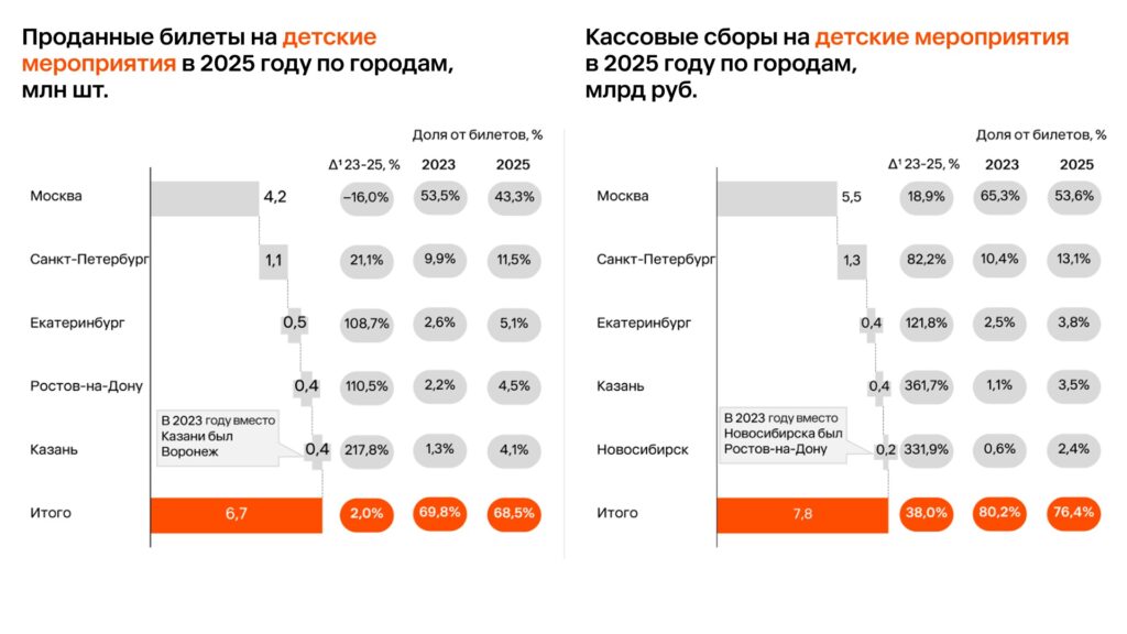 Крупнейшими рынками по количеству билетов и сборам в сегменте детских мероприятий остаются Москва, Санкт-Петербург и Екатеринбург. При этом выросла доля небольших городов не из топа-5: в регионах увеличивается количество мероприятий для детей, в том числе связанных с фольклором, историей страны и патриотическим воспитанием. Доля пяти крупнейших городов в объеме продаж в целом по стране снизилась с 80,2% в 2023-м до 76,4% в 2025-м.