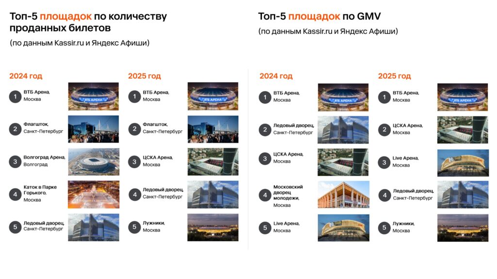 По данным билетных операторов, по объему проданных билетов традиционно лидируют площадки из Москвы и Санкт-Петербурга: ВТБ Арена, ЦСКА Арена и Live Арена.
