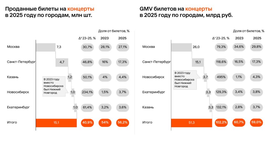 В сегменте концертов Новосибирск попал сразу на третью строчку топа-5 по продажам в штуках и в деньгах (на этой строчке он заменил лидера 2024 года — Нижний Новгород). Доля Новосибирска в общем объеме продаж билетов на концерты в России выросла с 1,1% в 2023 году до 4,3% в 2025-м.