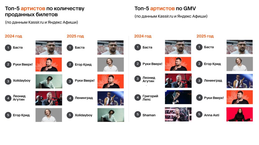 По данным билетных операторов, все звезды — лидеры по продажам в штуках в 2025 году нарастили продажи по сравнению с 2024 годом. Так, количество проданных билетов на концерты Басты в 2025 году составило 304 тысячи штук, что на 33% больше, чем за 2024 год. Продажи на концерты Егора Крида выросли на 201%, до 241 тысяч штук, группы Руки Вверх! — на 44%, до 193 тысяч штук, Xolidayboy — на 49%, до 138 тысяч штук.
