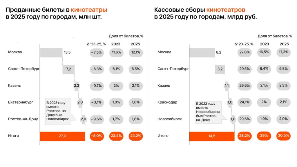 По итогам 2025 года концентрация рынка в 5 крупнейших городах выросла: на них пришлось порядка 40% билетов и около 60% сборов. В 2023 году доля этих городов была ниже: 37% по билетам и 55% по объему сборов.