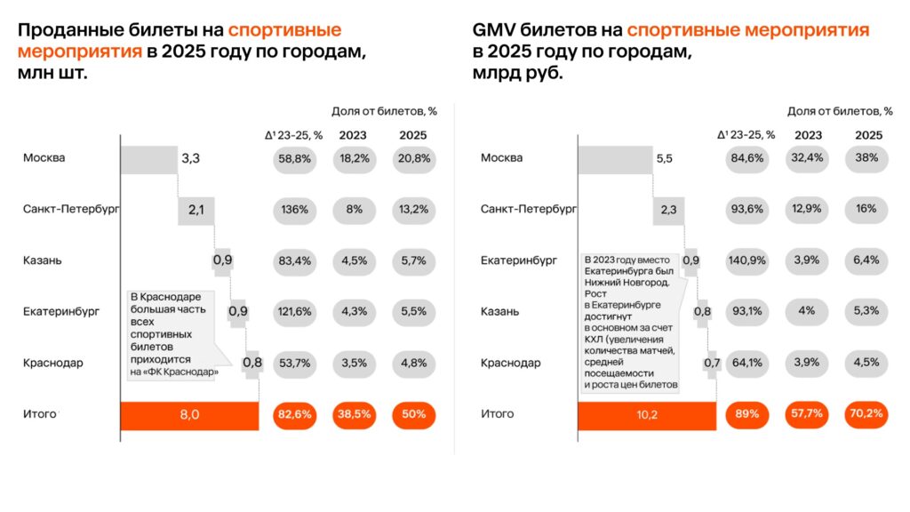 Количество спортивных мероприятий в крупных городах выросло: рынок спорта в целом восстанавливается после того, как в 2020–2022 годах столкнулся с оттоком зрителей из-за ковидных ограничений, изоляции российского спорта от международных турниров и введения системы Fan ID в футболе. Рост в 2024 и 2025 годах связан с рядом факторов, в том числе внедрением более сбалансированного календаря в КХЛ, введением в эксплуатацию новых более вместительных арен в КХЛ, постепенной адаптацией РПЛ к Fan ID. Также сохраняется рост цен на билеты в сегменте.