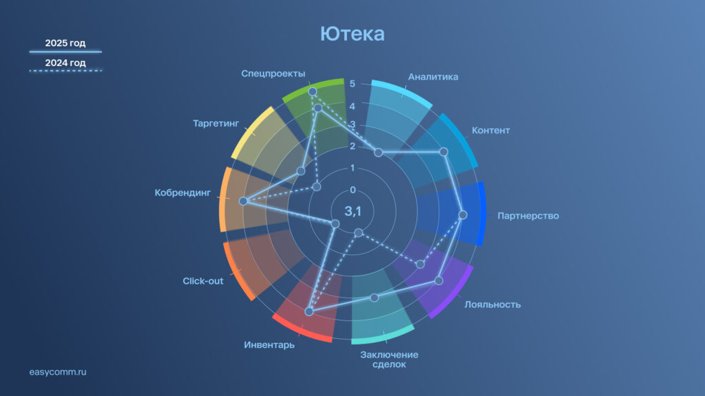 3. Ютека — лучшая среди аптечных сетей по комплексным спецпроектам и лояльности. Платформа заняла третье место в ранкере с 3,1 балла, продемонстрировав сбалансированность по всем критериям. Ключевые сильные стороны — готовность к запуску кастомных и игровых спецпроектов (лендинги, геймификация) и развитые механики работы с лояльностью (отзывы за баллы, таргетинг на участников программ).
