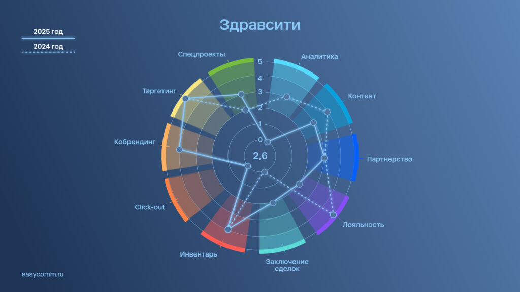4. «Здравсити» — лидер по таргетингу с инвентарем маркетплейса. С результатом 2,6 балла площадка заняла четвертое место, получив максимальный балл в категории «таргетинг», — ее возможности по сегментации аудитории соответствуют уровню Ozon. Рекламный инвентарь не уступает крупнейшим маркетплейсам, что делает ее полноценной цифровой рекламной площадкой для фармбрендов.