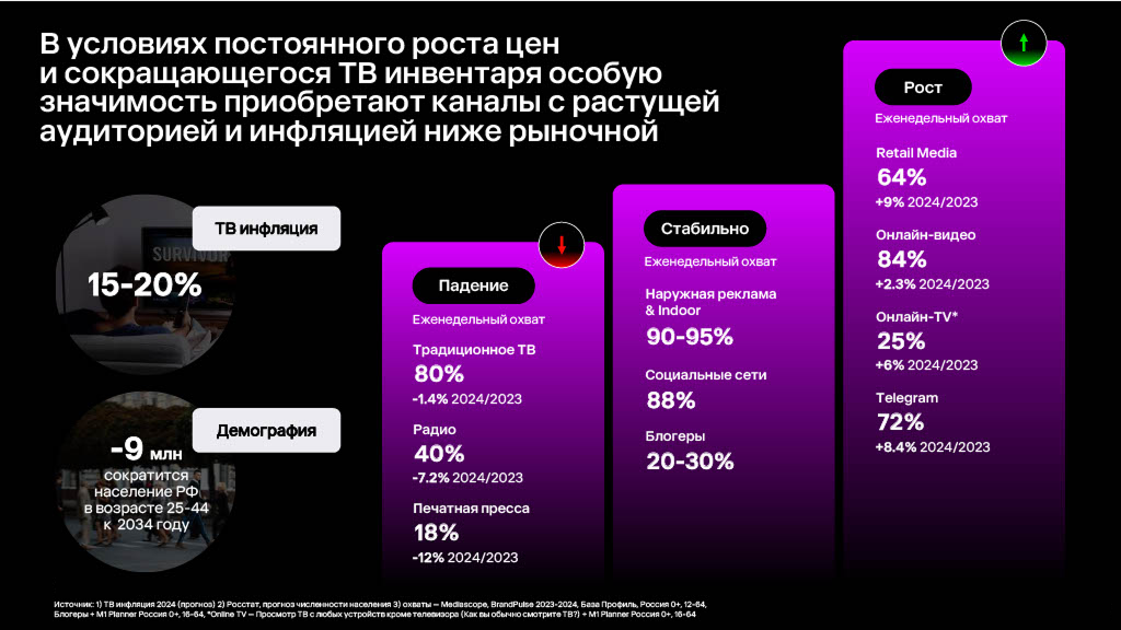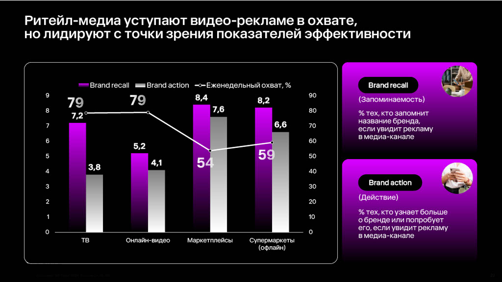 С точки зрения охватов (+9% за год) канал пока уступает видеорекламе, но лидирует по показателям эффективности. Например, метрики brand recall и brand action у ритейл-медиа почти в 1,5 раза выше, чем на ТВ.