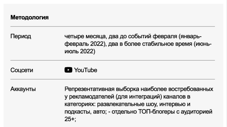 Исследование выделяет новый для рынка концепт — «потоковые категории» блогеров (в таких сегментах аудитория потребляет контент без привязки к конкретному блогеру). А также формулирует принципы, применение которых делает планирование кампаний более прозрачным и, как следствие, более эффективным.