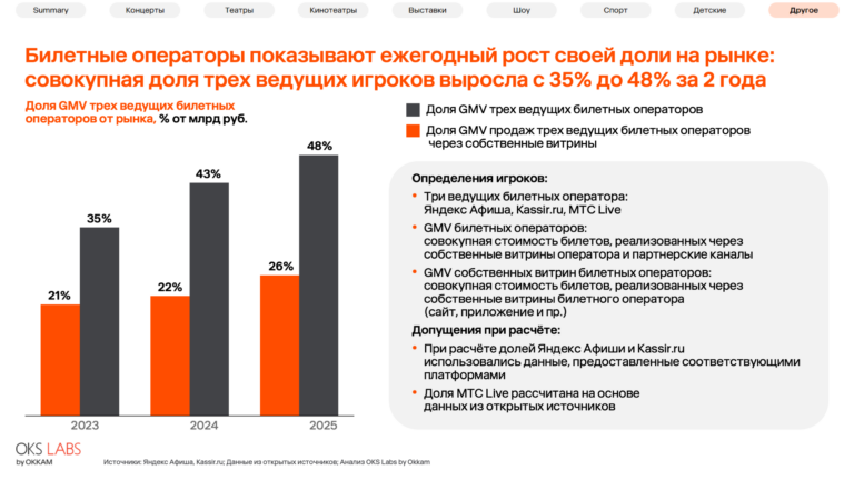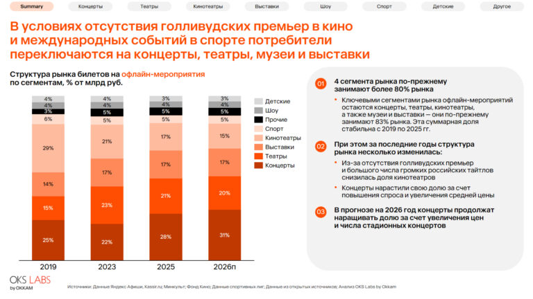 Консалтинговая компания OKS Labs (by Okkam) совместно с крупнейшими билетными операторами — «Яндекс Афиша», Kassir.ru и МТС Live — изучила российский рынок билетов на офлайн-мероприятия. В основе исследования — официальная отраслевая статистика, информация из открытых источников и данные самих игроков.