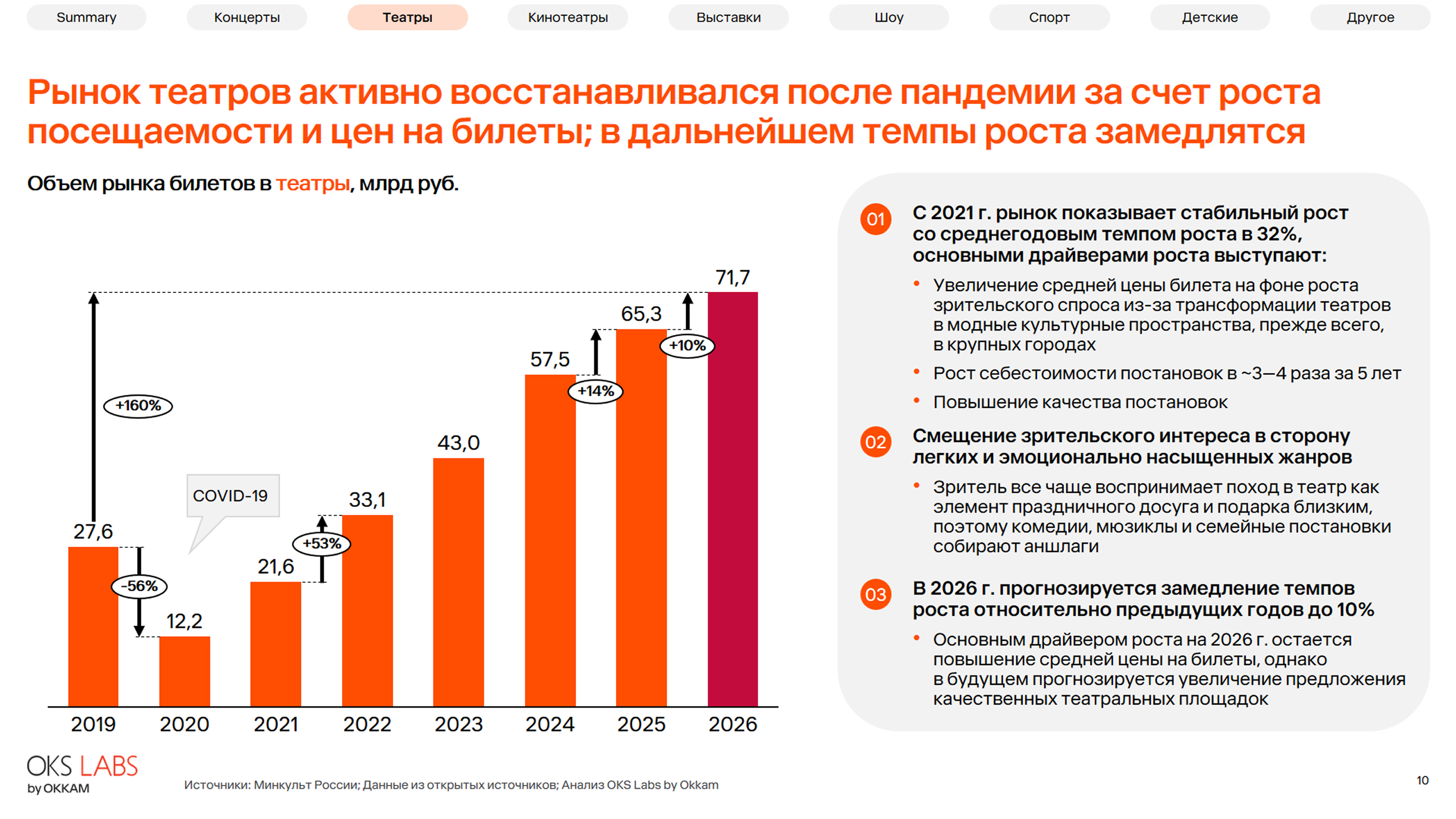• Рынок офлайн-мероприятий — в фазе интенсивного роста: в 2025 году он увеличился на 28% до 306 млрд руб. Несмотря на быстрое восстановление, которое началось в 2023-м, количество проданных билетов за год все еще ниже допандемийного уровня 2019 года в основном из-за сегмента кинотеатров.